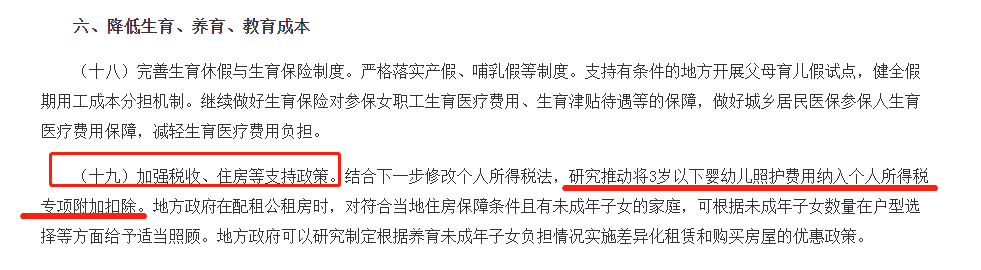 (十九)加强税收、住房等支持政策。结合下一步修改个人所得税法,研究推动将3岁以下婴幼儿照护费用纳入个人所得税专项附加扣除。地方政府在配租公租房时,对符合当地住房保障条件且有未成年子女的家庭,可根据未成年子女数量在户型选择等方面给予适当照顾。地方政府可以研究制定根据养育未成年子女负担情况实施差异化租赁和购买房屋的优惠政策。——摘自《中共中央 国务院 关于优化生育政策 促进人口长期均衡发展的决定》 (2021年6月26日)公告中明确:结合下一步修改个人所得税法,研究推动将3岁以下婴幼儿照护费用纳入个人所得税专项附加扣除。