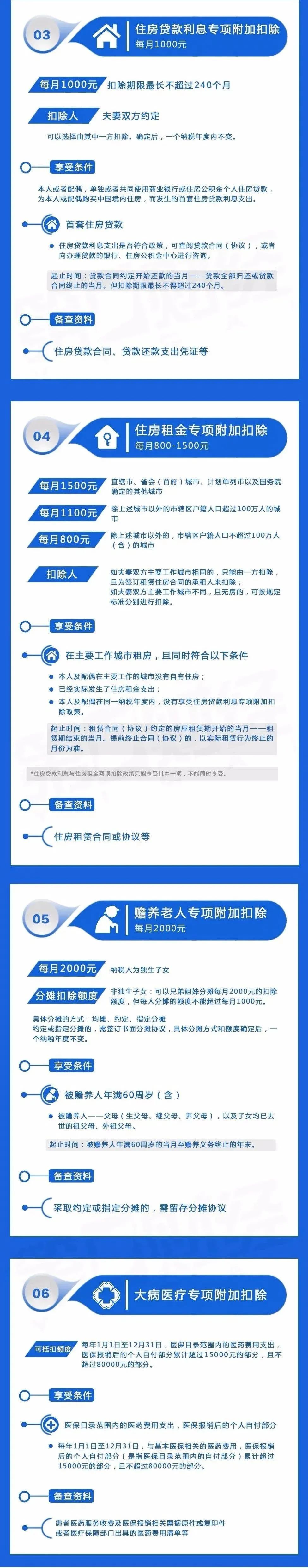 扣除范围:子女年满3周岁直至博士研究生毕业(全日制)时间范围:开始至结束当月,包括因病或其他非主观原因休学扣除范围:电大、自考、成人高考和远程网络教育、硕士和博士(非全日制)时间范围:开始至结束当月,同一学历(学位)继续教育的扣除期限最长不能超过48个月。可否转移:本科及以下的学历(学位)转为父母的子女继续教育注意:MBA、EMBA、MPA等属于硕士研究生学历扣除范围:技能人员职业资格继续教育、专业技术人员职业资格继续教育扣除范围:基本医保目录范围内的医药费用支出,医保报销后的个人自付部分(不包括医保目录范围外的自费)金额标准:由个人负担超过15000元的医药费用支出部分,在80000元标准限额据实扣除扣除方:夫妻约定由一方扣除,确定后一个纳税年度内不变时间范围:年满60周岁当月至赡养义务终止的年末金额标准:一共2000元/月