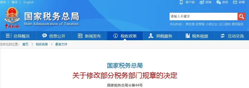 《国家税务总局关于修改部分税务部门规章的决定》,已经2018年6月5日国家税务总局2018年度第1次局务会议审议通过,现予公布,自公布之日起施行。