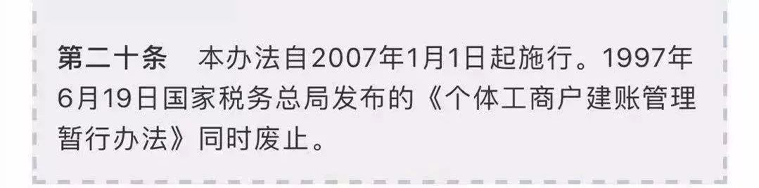第二十条 本办法自2007年1月1日起施行。1997年6月19日国家税务总局发布的《个体工商户建账管理暂行办法》同时废止。